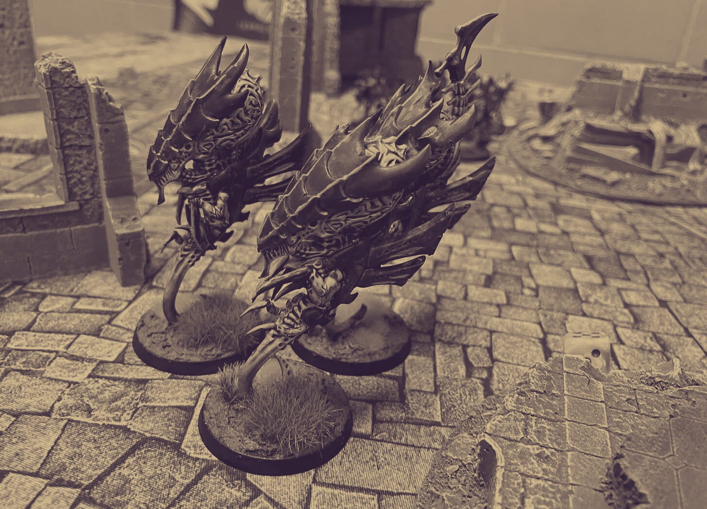 A trio of bio-forms wreathed in lightning – zoanthropes – emerged from rubble as plaguemortar bombardments slammed into packs of xenos vermin. The ground shook from the unrelenting artillery. But something else was sending vibrations into the crumbling stone walls that Lord Voivode had taken cover behind. He rested the barrel of his plaguespewer on the edge of a shattered arch and could feel the buzz of many termagant claws thrashing and bounding closer.