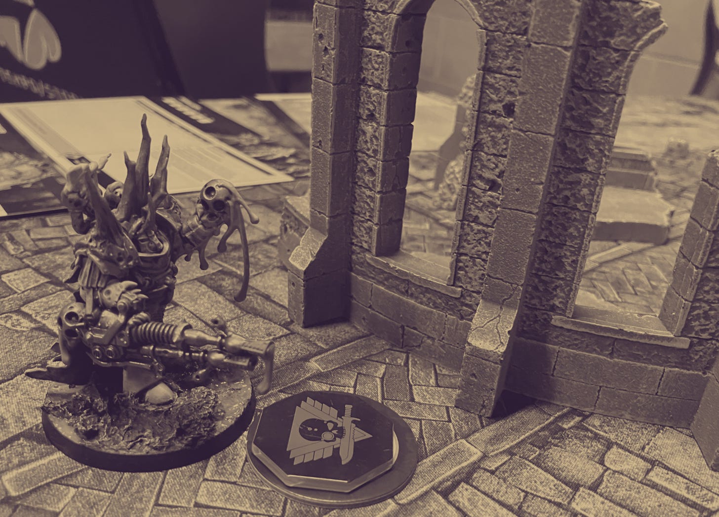 Triumphant, Lord Voivode advanced. He knew he needed to hold the line, to make a stand, to maintain supply lines and allow his vectorium more time to spread their Everbleed Contagion. This dead world would soon be teeming with life empowered by Papa Nurgle’s bountiful gifts. The future was looking bright –